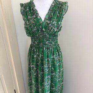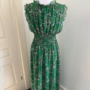 The perfect dress for date night, a summer garden party, or outdoor wedding! This sleeveless, maxi-length dress features a delicate floral print of white, beige, blue and black on an emerald-green background. It has a V-neckline trimmed with a narrow sheer ruffle, which also adorns the sleeve edge. There is a wide elasticized and smocked waistline which provides a flattering gathered bodice and skirt without being bulky. The dress body is lined in solid green. Fabric is 100% Polyester. Size Medium with measurements taken flat and unstretched: Bust 15 1/2", Hips 21", Length from Shoulder to Hemline 50". In Excellent Preowned Condition.