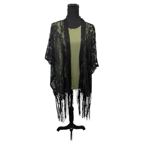 Elegant black lace kimono with fringe detailing. Perfect for layering.