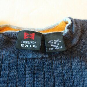 Emergency Exit Boys Sweater 10/12 Blue with Grey Sleeves with Yellow Pinstripes. Used. 55% Ramie 45% Cotton. Approx. Measurements: Collar to Bottom of sweater 19”’, Underarm to under arm 17” Collar to end of sleeve 23”, Back of Collar seam to bottom of shirt 23”. Gently Loved. Pet Friendly Home