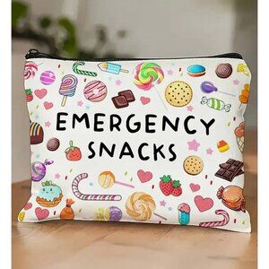 This little bag is covered in colorful pictures of candies, cookies, and treats, and it says "Emergency Snacks" on it. It's got a zipper, so you can keep everything inside, and it's made of a light fabric that's easy to toss in your purse or suitcase. It's a fun way to keep your makeup or other small things organized, and it's sure to make you smile whenever you see it.