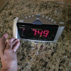 Emerson Research award-winning and patented SmartSet technology, the flashing "12:00" display is a thing of the past. The clock radio automatically sets itself on the first use to the correct year, Month, date, day, and time. The clock radio Features a 180 degree swivel projection that provides a clear view of the time on your wall or ceiling in red, blue, or green light. Includes 2 level dimmer control. Dual alarms. Set the alarm to wake you to your favorite FM music or news station, buzzer alarm or programmable sleep-to music timer. The clock radio adjusts itself automatically for daylight savings time and leap year, as well as maintains the correct time when the power returns after power outages. Crescendo wakeup control.