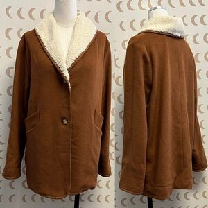 -80% Wool, 10% Nylon, 10% Cashmere body w/ faux sherpa collar and cuff