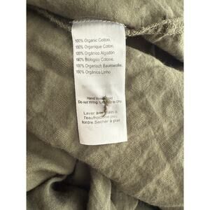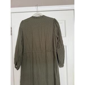 The Emerson Fry Frances Dress in size Medium features a charming moss green Swiss dot pattern, long sleeves, a V-neckline, and button closures. Made from 100% organic cotton, this lightweight woven dress is perfect for various occasions such as travel, weddings, parties, and casual outings. With a length of 50 inches and a flattering A-line silhouette, this maxi dress exudes a Bohemian, tropical, and cottage-inspired vibe, ideal for the summer, fall, and spring seasons. Imported from India, this designer piece is a must-have for women looking for a stylish and comfortable addition to their wardrobe.
