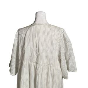Features: rainbow lurex striping, v-neck tie front, short sleeve, flare hem, cotton airy blend