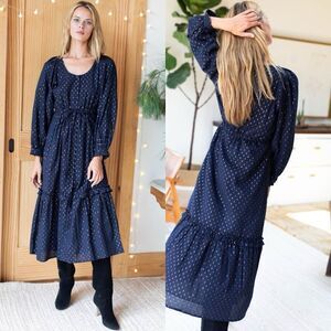 Emerson Fry India Collection Lucy Lake Boho Midi Dress Navy Gold Dots XS
