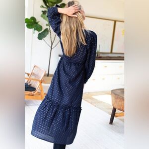 New Emerson Fry India Collection Lucy Lake dress - maritime gold dot lurex. Size XS. Navy blue and gold Metallic block print, 100% cotton with gold dot lurex, scoop neckline, subtle gather at shoulder, long sleeve, ruffle, button cuff, button front, drawstring at the waist for a flattering silhouette, lined, ruffle skirt accent.