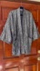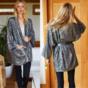 Emerson Fry kimono style open cardigan covered in silver sequins. Also has a gray sash that can be tied around the waist. The front has two well hand pockets. The small string belt loop is missing on one side (see intact one in photo). Measures 25.5 inches across chest and 32 inches long. There are some light marks on the inner neckline that I have not tried to dry clean but are shown in the photo. There are no stains, marks, or areas of missing sequins on the outside.