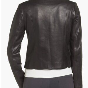 Purchased from Nordstrom - excellent condition (wore a few times). Collarless leather jacket (lined) finished with rounded front hem.