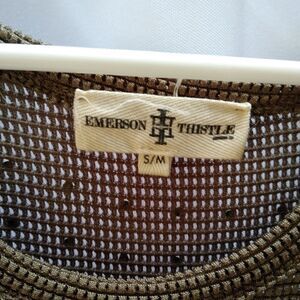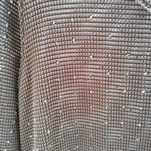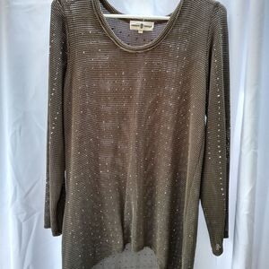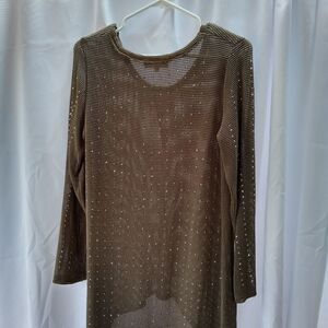 Green gold colored loose knit top with metal stud embellishments, longer in the back, long sleeves. Q