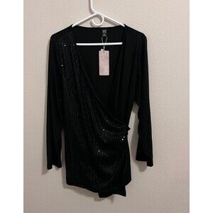 This is a black Emery blouse in size 2XL, designed as a wrap style with sequin detailing. It is a plus-size women's top from the brand EMERY.