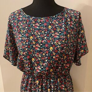 Emery Rose plus-size midi dress from Shein, size 2X. Black with red and yellow floral design. Short cap sleeves, crew neckline, and elastic waistline. Unlined. Lightweight and breezy pull-on style (no zippers or buttons). New without tags, never worn, and in pristine condition with no flaws.