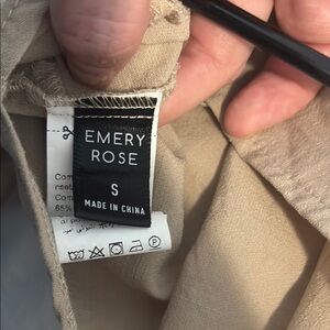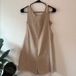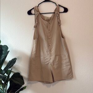 Stylish tan romper with button-down front and tie straps. Apron pockets. Perfect for casual outings. Emery Rose size small.