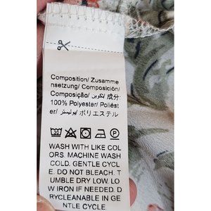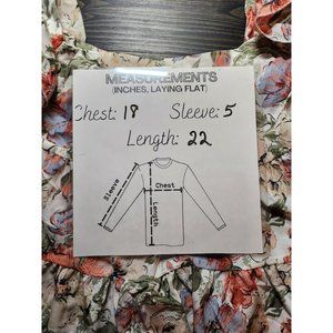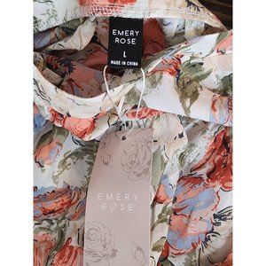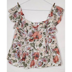 Emery Rose Tired Ruffle Top with Ruffle sleeves. Cream color with beautiful Rose Pink, Greens and Light blue flowers. Size large