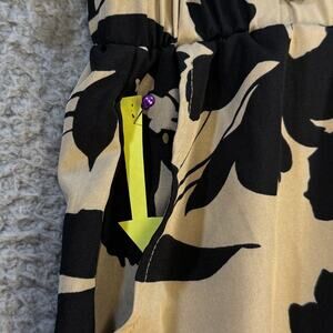 Emery Rose women’s wide-leg pants in a tan and black floral print. Features an elastic waistband with an adjustable drawstring and a relaxed, wide-leg silhouette with side pockets. Due to the print, the pockets are subtle and hard to see, so a photo with a yellow paper insert was included to show pocket placement clearly. The previous owner has removed the original size tag. Suitable for casual everyday wear.