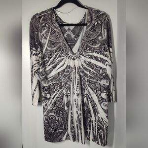 Stylish paisley V-neck tunic top with long sleeves. Features a black and white pattern.