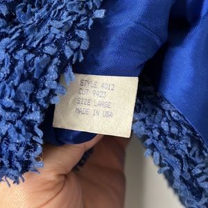 Vintage blue ribbon textured zip blazer. Shoulder pads. Marked large. Some wear around collar and cuffs, excellent life left.