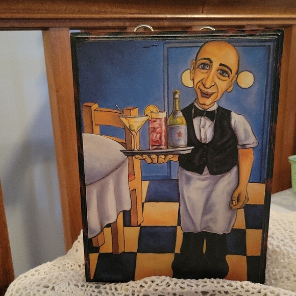 Vibrant art plaque featuring a waiter with drinks. Canadian artist~8x10-1/2 print on wood board ~mint condition~NWOT