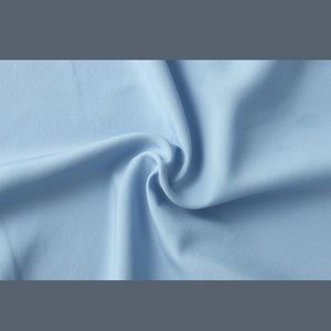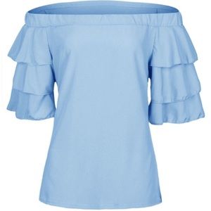 Adorable off-the-shoulder powder blue top. Sleeves have three layers of ruffle details. Materials: 95% Polyester 5% Spandex