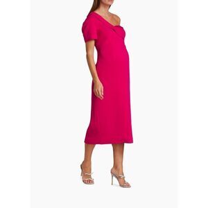 Pink crepe (96% Viscose, 4% Spandex). Sheath. Short sleeves. V-neck. Side zipper closure. 50 inch from shoulder to hemline.