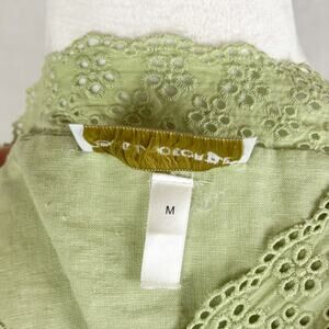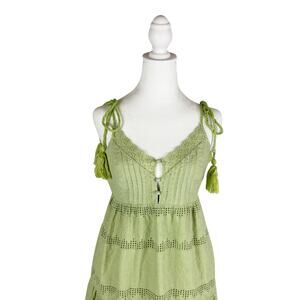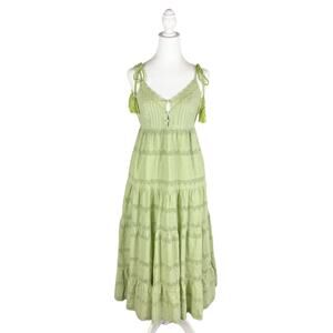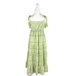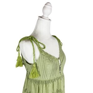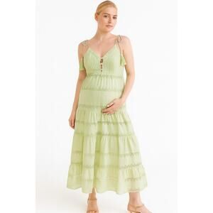This pastel green maternity dress combines comfort and elegance with its pleated bodice and flowing skirt, perfect for any occasion. Delicate lace-like cutouts and tassel-accented adjustable straps add a touch of feminine charm while accommodating your growing bump.