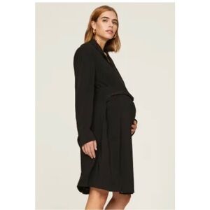 Black crepe (96% Viscose, 4% Spandex). Wrap. Long sleeves. Collar. Front button closure. 37.5" from shoulder to hemline. Imported.