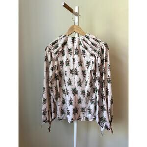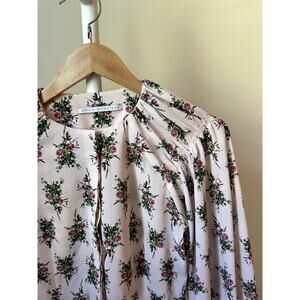Romantic Emilia Wickstead blouse in blush pink silk crepe, printed with delicate green and rose florals. Designed with softly gathered shoulders, a round neckline, and gently blouson sleeves with buttoned cuffs, this piece embodies the label’s refined femininity and vintage-inspired charm. Finished with a concealed button placket for a seamless silhouette. Worn once and in excellent condition—no marks or pulls.