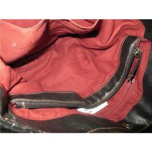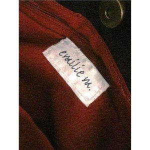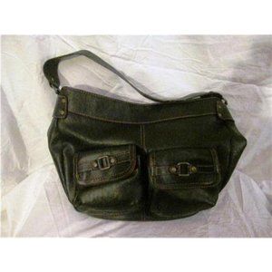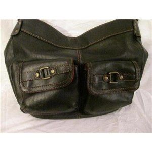 Emilie M. large, black, satchel style, purse with red & brass tone accents! A great looking, classic purse with a lot of style! This bag is black, buttery faux leather with red contrast stitching and brass accents. Inside, it has a red fabric lining. There are three compartments and multiple exterior pockets to keep you organized. It has a magnetic snap closure with a twist lock. 14.5" x 11.5" x 5". All measurements are approximate. J0701