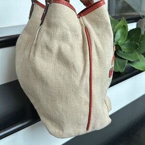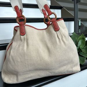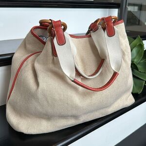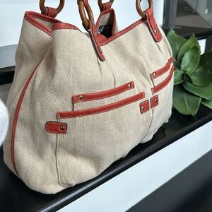 Discover the perfect blend of style and functionality with this canvas/ linen and rust vegan leather bag. Ideal for everyday and perfect for the season ahead. this bag offers ample space and a chic design with accents of orange, vegan leather and shiny Silver-toned hardware nail head design. Note the beautiful wooden accents at the base of each of the reinforced shoulder straps and the beautiful compartments on the front of the bag, making reaching your cell phone or other must get two items easy. This beautiful bag has a fall vibe with the soft linen canvas fabric paired with the wooden accents and coloring on the purse. The straps are easy to carry and have an approximate 10 inch drop. The top of the bag has a strong and secure snap closure and opens to a long center zip pocket dividing the oversize bag into two sections. The bag has a zipper pocket and two open pockets inside for organizing as well as tons of room for all your things.The base of the bag measures approximately 16 1/2 inches across and the purse stands approximately 13 inches tall. The base of the bag is 6 inches wide. Clean and non-smoking.