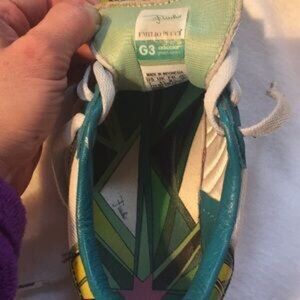 Authentic designer Emilio Pucci Adidas Tennis Shoe. Size 7. Great used condition. This sneaker is part of the Adidas Century product line and was released in 2006. A new pair is selling for 800 euros on ebay. I wear a women's size 7 and these are a little big for me. Length along bottom sole measures10.5 inches. Comes from smoke free home.