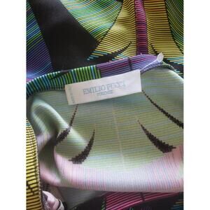 Black, green and purple Emilio Pucci silk printed dress with bateau neckline and matching sash.
