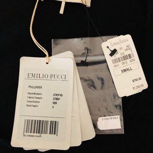 Emilio Pucci Black Scoop Neck Wool Sweater w/ Lace Panels - Made in Italy, black, size Small, Handmade lace on arms, fathered sleeve ends, deep scoop neckline, pullover style, 100% laine wool - Shoulders 16", Bust 34", Sleeves 26", Length 24" Purchased at Neiman Marcus- full price $1250.00 Pristine condition - SEXY
