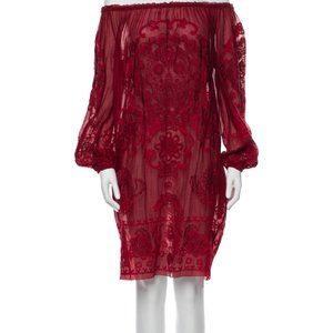 Collectors item in size 40 it. Fits any size as the neck is quite stretchy, however you can belt it as well. A beautiful deep red color, nearly burgundy and is semi sheer. Beautiful piece to keep forever. Some of Peter Dundas's best work!