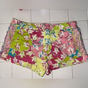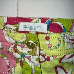 Women’s Emilio Pucci shorts with lively patterns. Features pink and green hues.