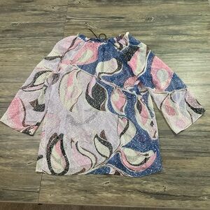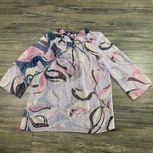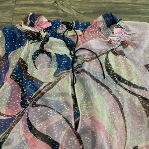 Stock photo is very similar to item, but maybe a tad different print. It does not come with the liner, and the informational and size tag was removed. It feels like very lightweight silk, with silver metallic throughout. Gorgeous and in great condition. Approximate measurements are as follows: