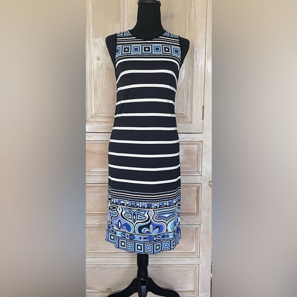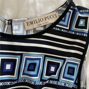 Emilio Pucci Sleeveless Shift Dress- Black, White & Blue Geometric Print