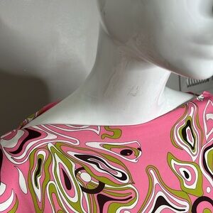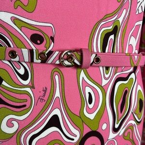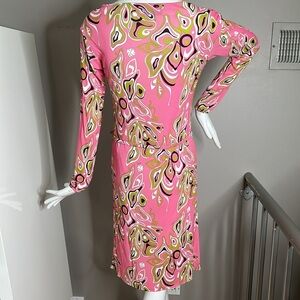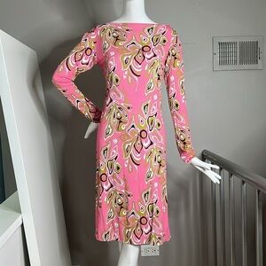 This is a beautiful Emilio Pucci Sz 38 / US 6 Long Sleeve Midi Dress with Belt and Travel Bag. Never worn. Can be worn with or without the belt. Boat neck. Travel cinch bag can be worn as a little purse. No odors. No stains.