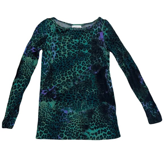 Striking long sleeve top from Emilio Pucci featuring a vivid green, blue, and purple abstract leopard print. Crafted from ultra-soft viscose with a flattering stretch fit and classic crew neckline. A bold piece that pairs well with jeans, trousers, or skirts for a standout look.