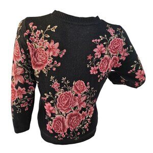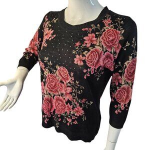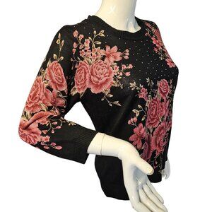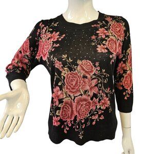 Emily Daniels Black Sweater Pink Roses Size PS Rhinestones Lightweight Acrylic