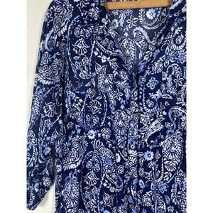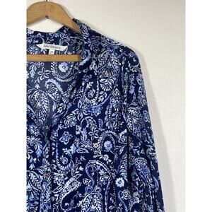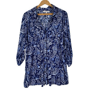 Emily Daniels Top 2X Blue Paisley Slinky Knit Travel Button Up Coastal Mature