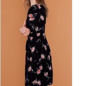 Emily and Fin's best selling Heather dress is back for this season in this fabuloud retro Pom Pom floral prunt on a black backgroud. A beautiful A-line semi-tailored dress with elbow length sleeves and a straight skirt that sits on the knee. A flawless Retro dress perfect for spring festivities.