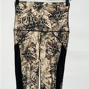 Emily HSU Designs Animal Print Leggings Mesh Side Panels - Size Small. Great pre-owned condition. Not sure if it's leopard or reptile print or what. High rise, side mesh panels in black, full length. Approximate measurements: 11 1/2" waist, 12" rise, 31" inseam.