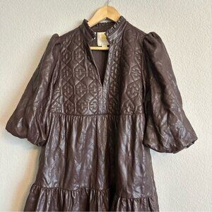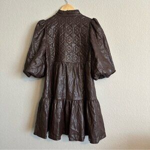 Channel bold Matrix-inspired energy with this Emily McCarthy Frankie Dress in a steampunk-chic faux leather finish. The deep brown hue, structured puff sleeves, and quilted bodice create a fusion of retro-futuristic elegance with a wet-look edge. Perfect for layering with combat boots, corset belts, or industrial accessories for a cyber-goth or dark academia vibe. Size XXS. Elevate your wardrobe with this statement piece!