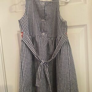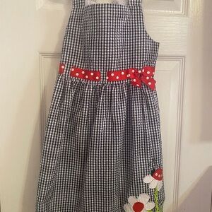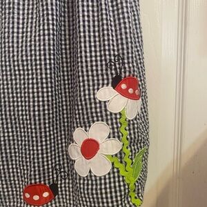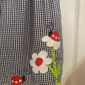 Navy and white gingham sundress with ladybug and daisy appliqués