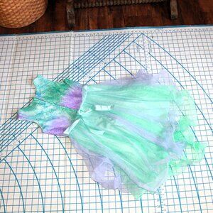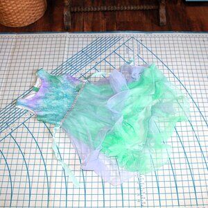 Skirt has 2 layers of mesh with curled hems - long aqua layer and short lavender layer