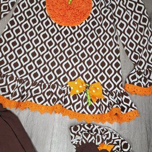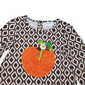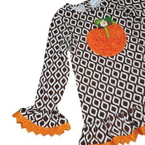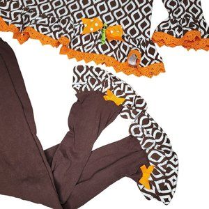 This "Emily Rose Pumpkin Patch Fall Ruffle Lace Ribbon Halloween Bell Sleeve Outfit" is a stylish ensemble for girls size 8. It features a playful mix of brown, orange, and white, perfect for the fall season.