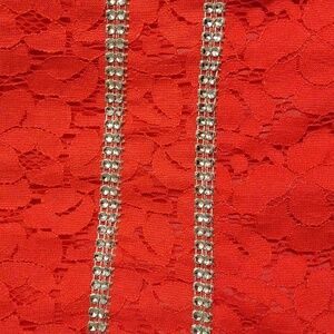 Strawberry red, lace dress, zipper back, two neck buttons and rhinestones across the waist (front only)