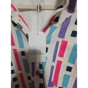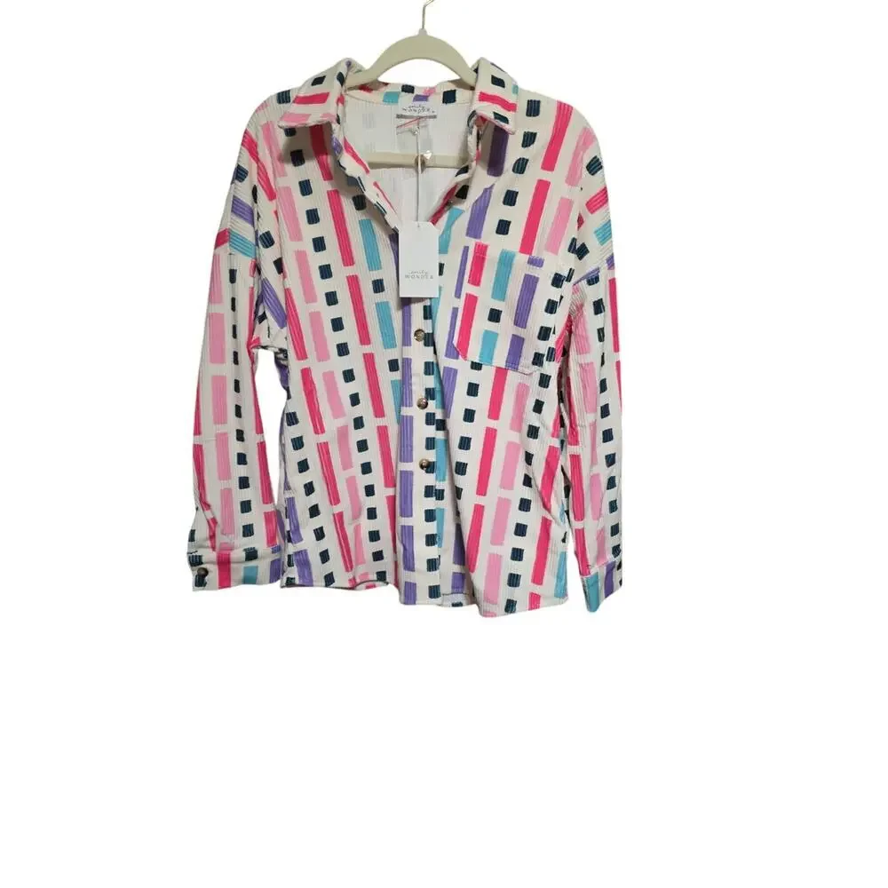 New with tags Emily Wonder ribbed geometric print shacket jacket in a bold pink, teal, purple, and navy colorblock pattern. This lightweight textured button-front layer is perfect as a statement overshirt or transitional jacket.