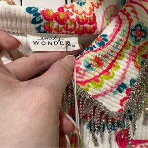Stunningly gorgeous and vibrant multicolor paisley print ribbed jacket with rhinestones fringe on the collar, but it can very easily be taken off if that’s what you prefer!