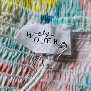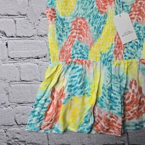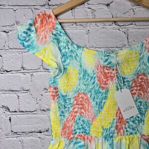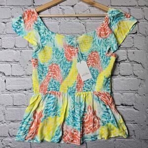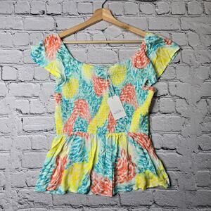 Emily Wonder Watercolor Blue Red Yellow Smocked Ruffle Hem Blouse New Size Large
