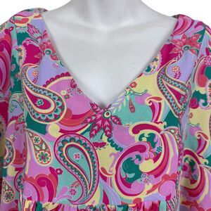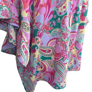 This Emily Wonder women's top features a vibrant paisley pattern with 3/4 dolman sleeves and a stylish V-neckline. The blouse is in size 1X and has a relaxed fit, perfect for casual or travel occasions during the summer, fall, and spring seasons. The lightweight polyester material is adorned with ruffle accents, adding a touch of flair to the colorful design. This pullover blouse is designed for easy care with hand washing instructions, making it a versatile and fashionable addition to any wardrobe.